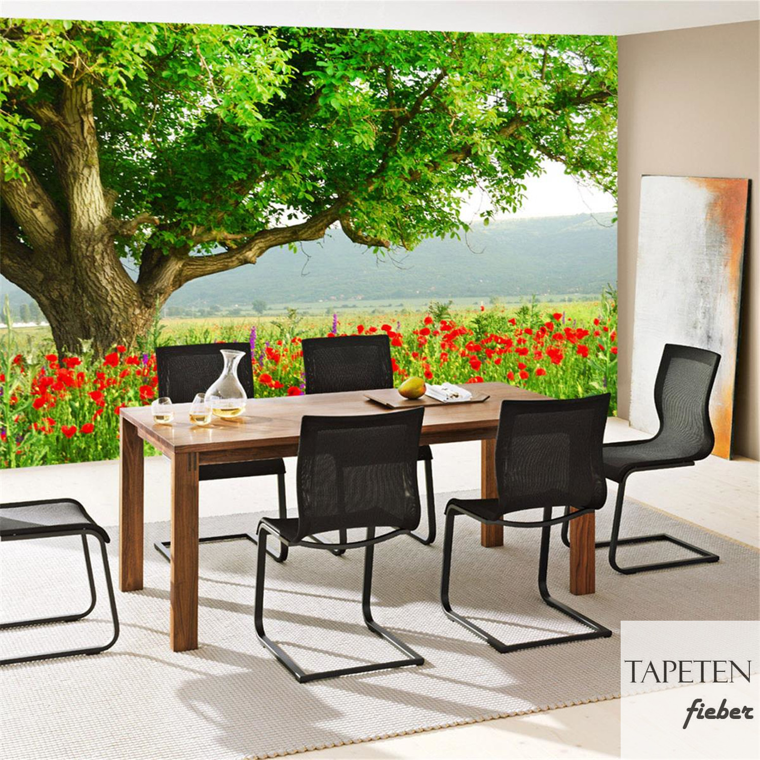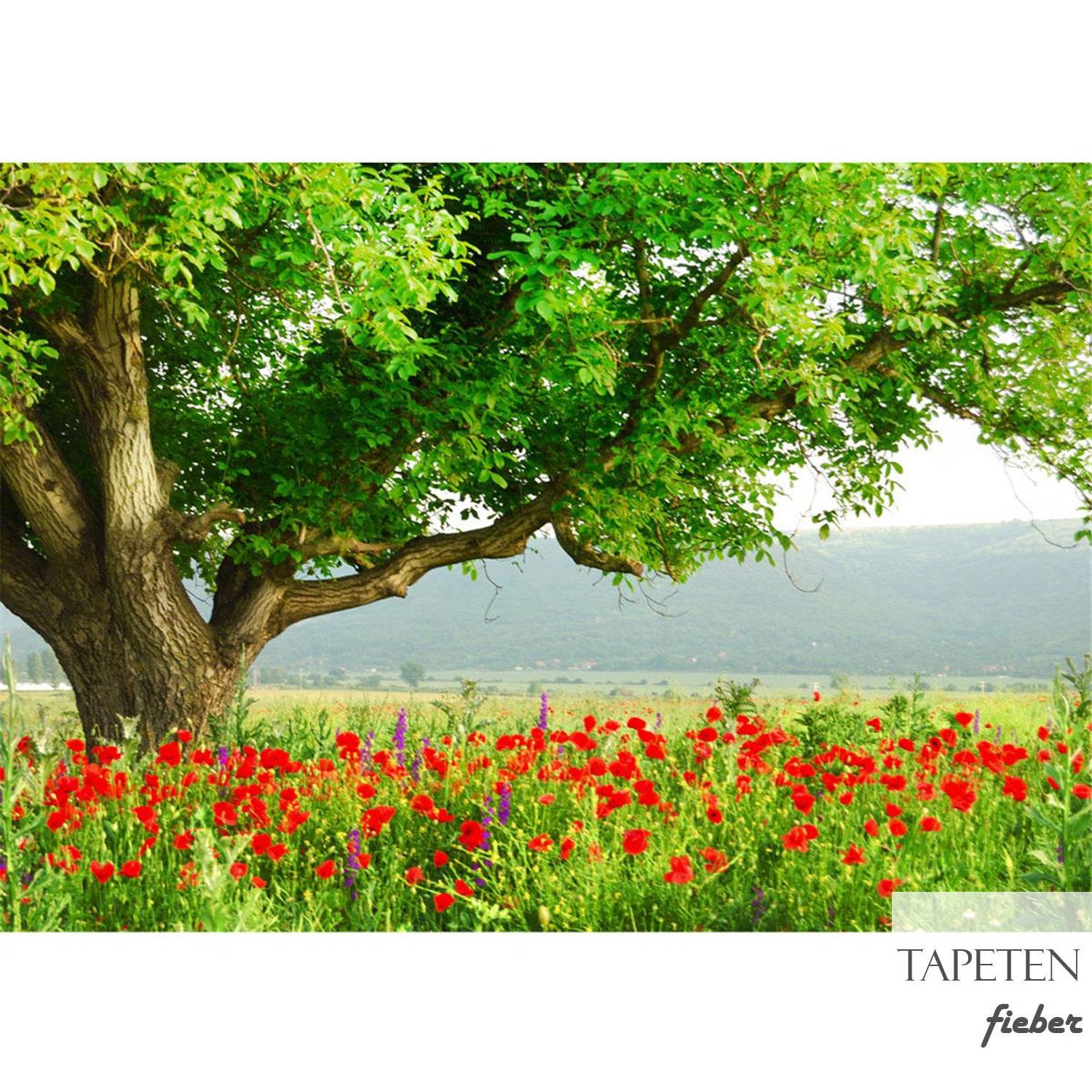 Fototapete Natur Mohn Feld Baum Wald Bäume rot grün Idyll no. 90